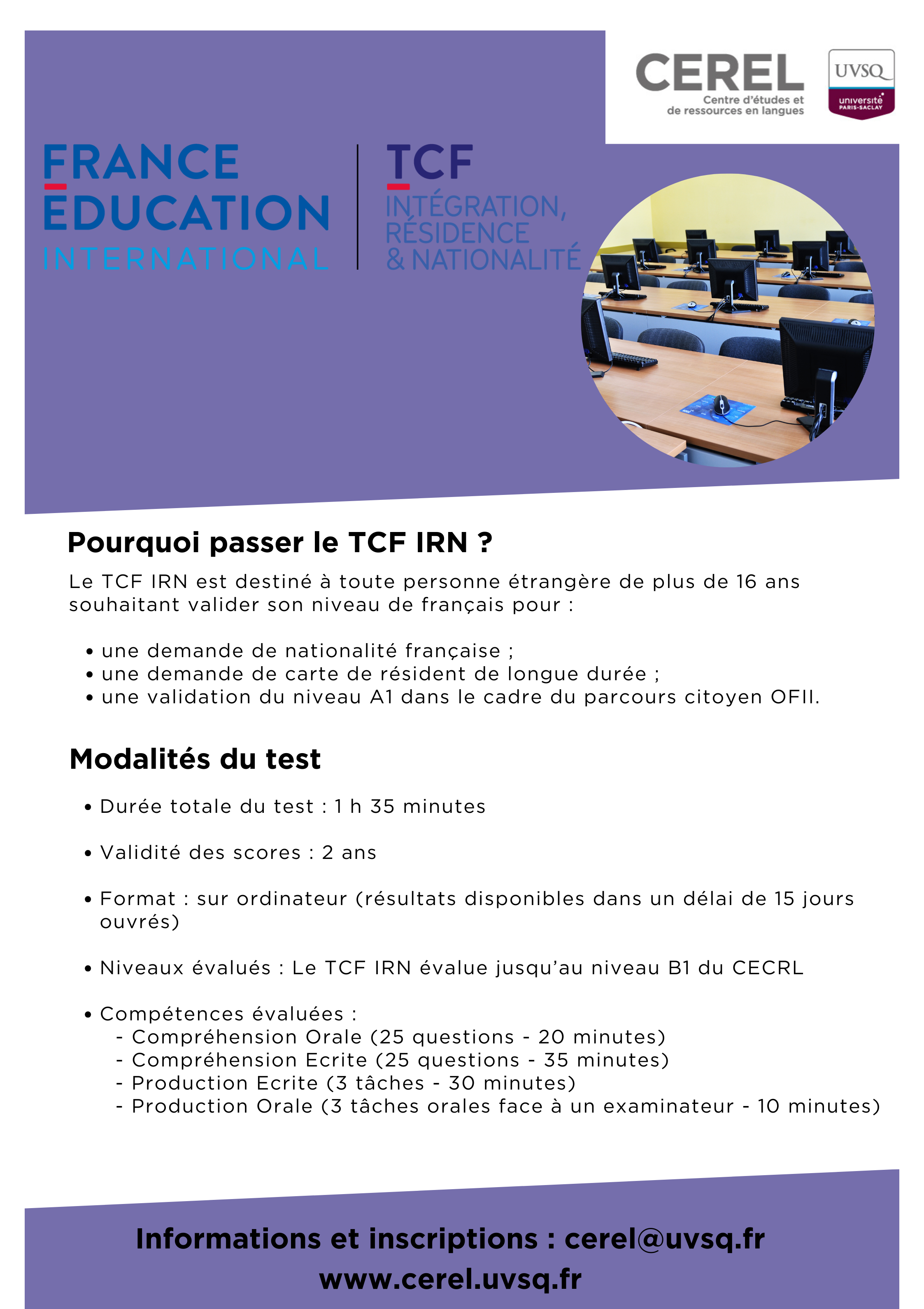 Le TCF « Intégration, Résidence et Nationalité » Sur Ordinateur est une variante du TCF qui s’adresse aux non francophones qui entament certaines démarches administratives : le TCF IRN permet de justifier de son niveau de français dans le cadre d’une demande de naturalisation (B2) ou pour l’obtention d’une carte de résident longue durée (B1).